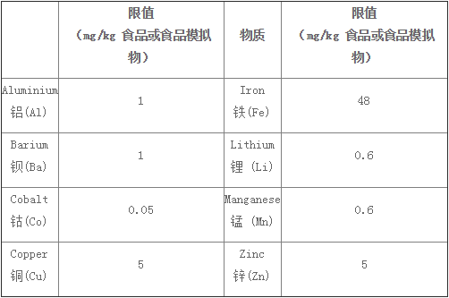 2. 附錄II部分新增鋁的遷移限量,修訂鋅的遷移限量和附錄III中的表2針對新鮮或冰鮮的水果及蔬菜食品模擬液,這兩部分從2018年9月14日正式生效。