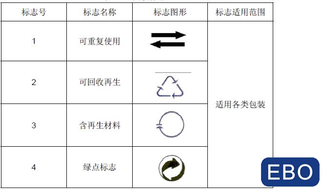 2001 年,強制性的國家標準GB18455-2001《包裝回收標識》出臺,并通過引用而成為《標識標準》的一部分,解決了《標識標準》關于包裝物名稱標識的問題。該標準引用了GB/T 16716-1996《包裝廢棄物的處理與利用通則》中的各項定義,對于包括塑料,紙張,木材等在內的各種可回收復用及可再生利用的包裝標志種類、名稱、尺寸、顏色都等作了明確的規(guī)定,大大增強了實際可操作性。其主要內容概括如下: