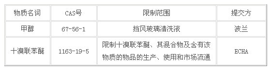 2014年8月1日,歐洲化學(xué)品管理局(ECHA)公布甲醇和十溴聯(lián)苯醚的限制提案,具體物質(zhì)和限制范圍如下: