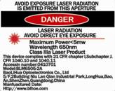 Class2:是指激光出口光功率在0.4mw至1.0mw之間的低幅射的可視激光,人眼睛受強光不適自然反應閉合眼睛的反應時間是0.25秒,在0.25秒的曝光量不可超過MPE值,這類能級的激光一般認為是安全的,但盡管如此,建議也不要長時間直視激光光束。 |